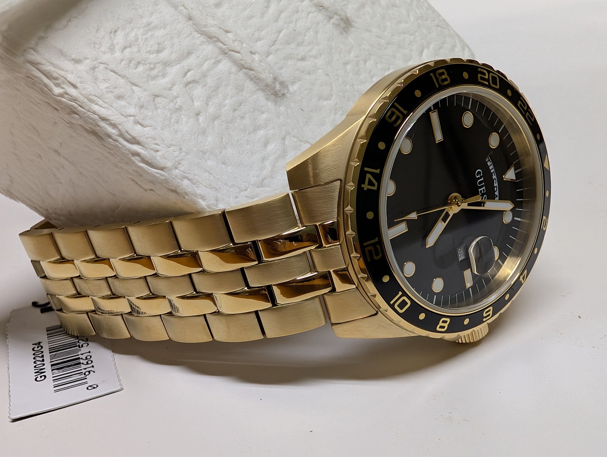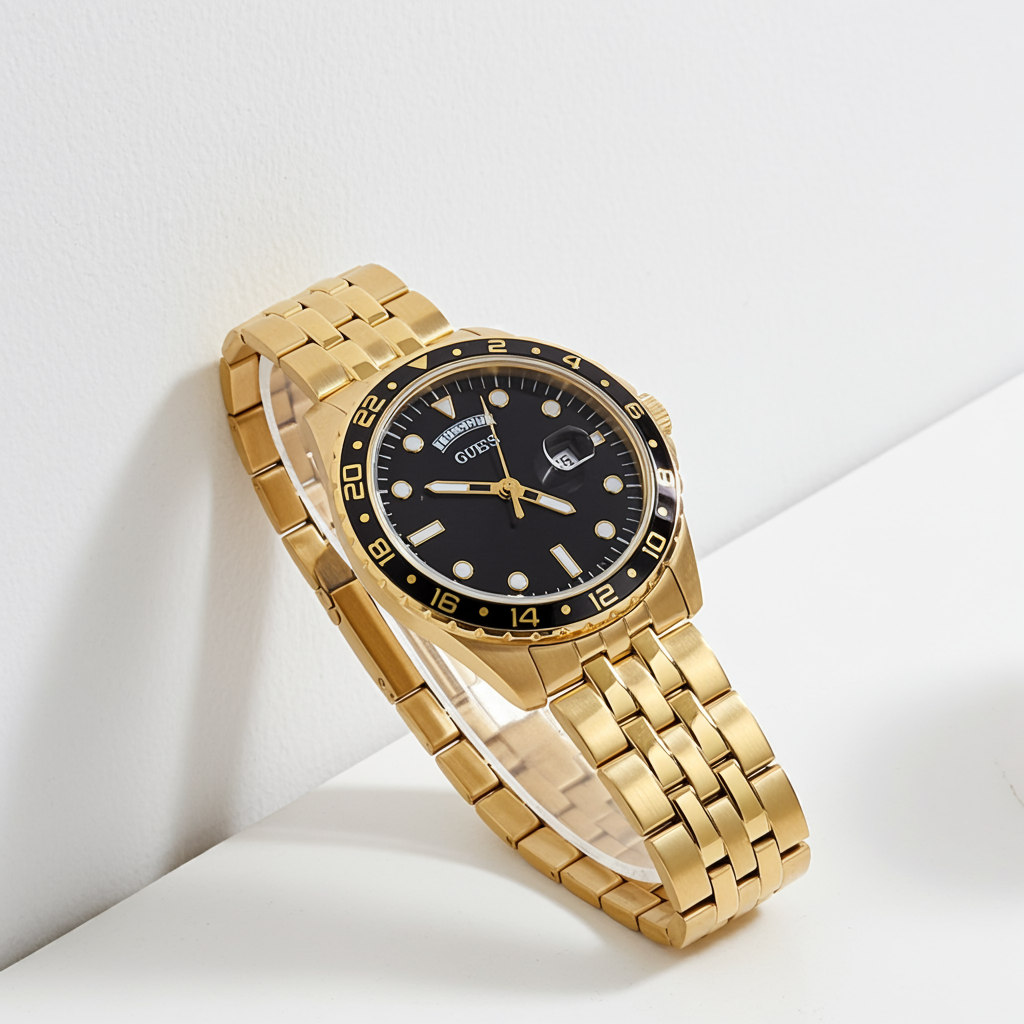 Elevate your style with the GUESS Mens Watch GW0220G4, a sophisticated timepiece that perfectly blends classic design with a modern edge. This watch features a stunning gold-tone stainless steel case and bracelet, exuding a luxurious and polished look. The bold black dial provides a striking contrast, detailed with luminous hands and markers for easy reading in any light. A day and date display adds practical functionality to its elegant design.