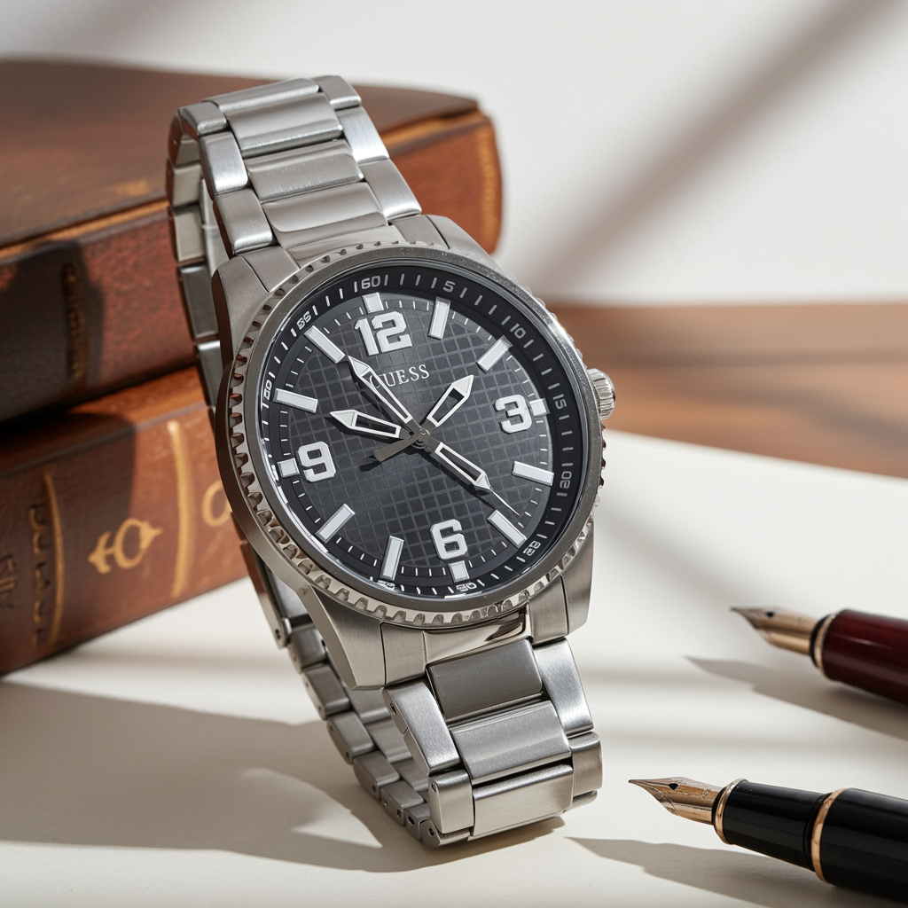 Make a bold statement with the GUESS "Varsity G" watch, a perfect blend of modern style and classic sophistication. This timepiece features a sleek, round silver-tone stainless steel case with a striking black dial, creating a clean and contemporary look. The analog display is powered by a reliable quartz movement, ensuring accurate timekeeping for your busy life.