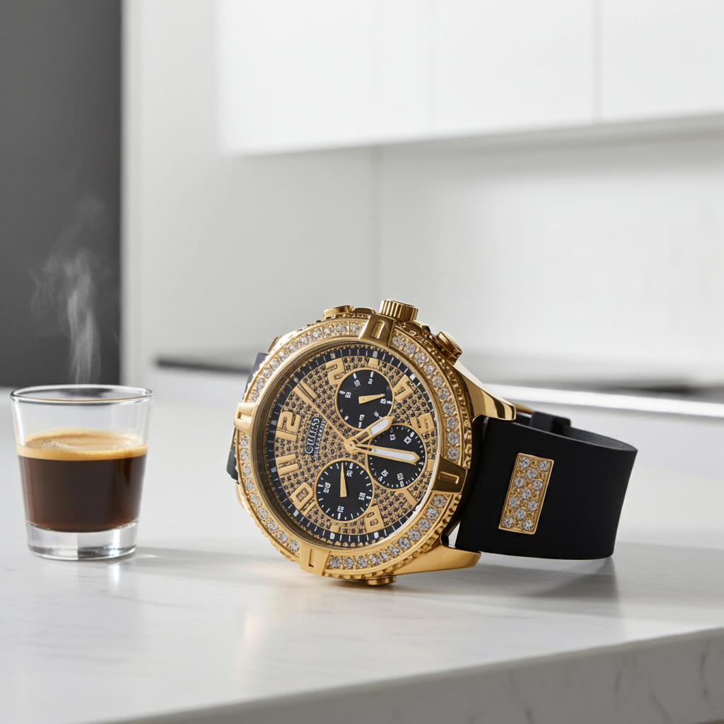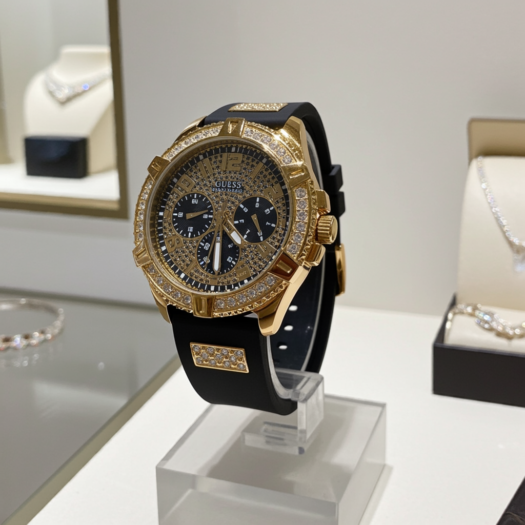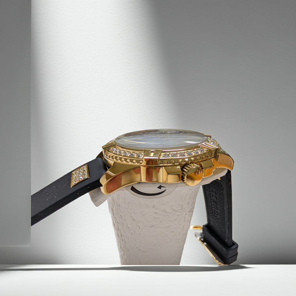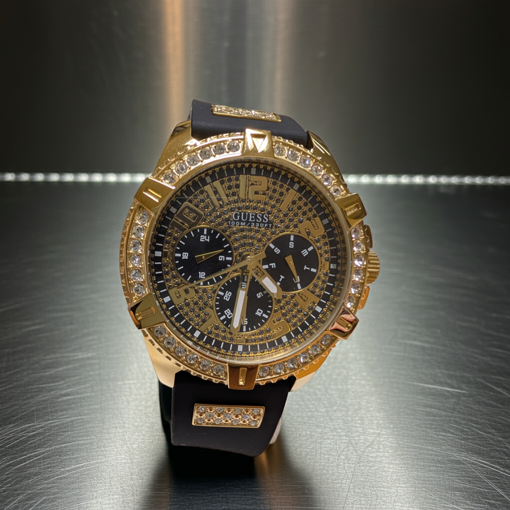 Unleash your bold style with the GUESS "Frontier" watch, a dynamic timepiece that perfectly marries rugged design with high-end glamour. This striking watch features a substantial 48 mm round, gold-tone stainless steel case. The fixed bezel is completely set with sparkling crystals, adding an undeniable flash of luxury.