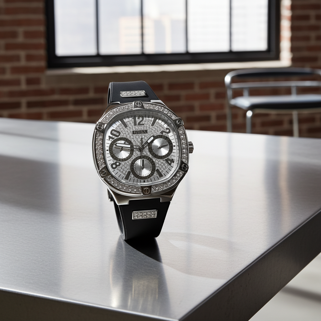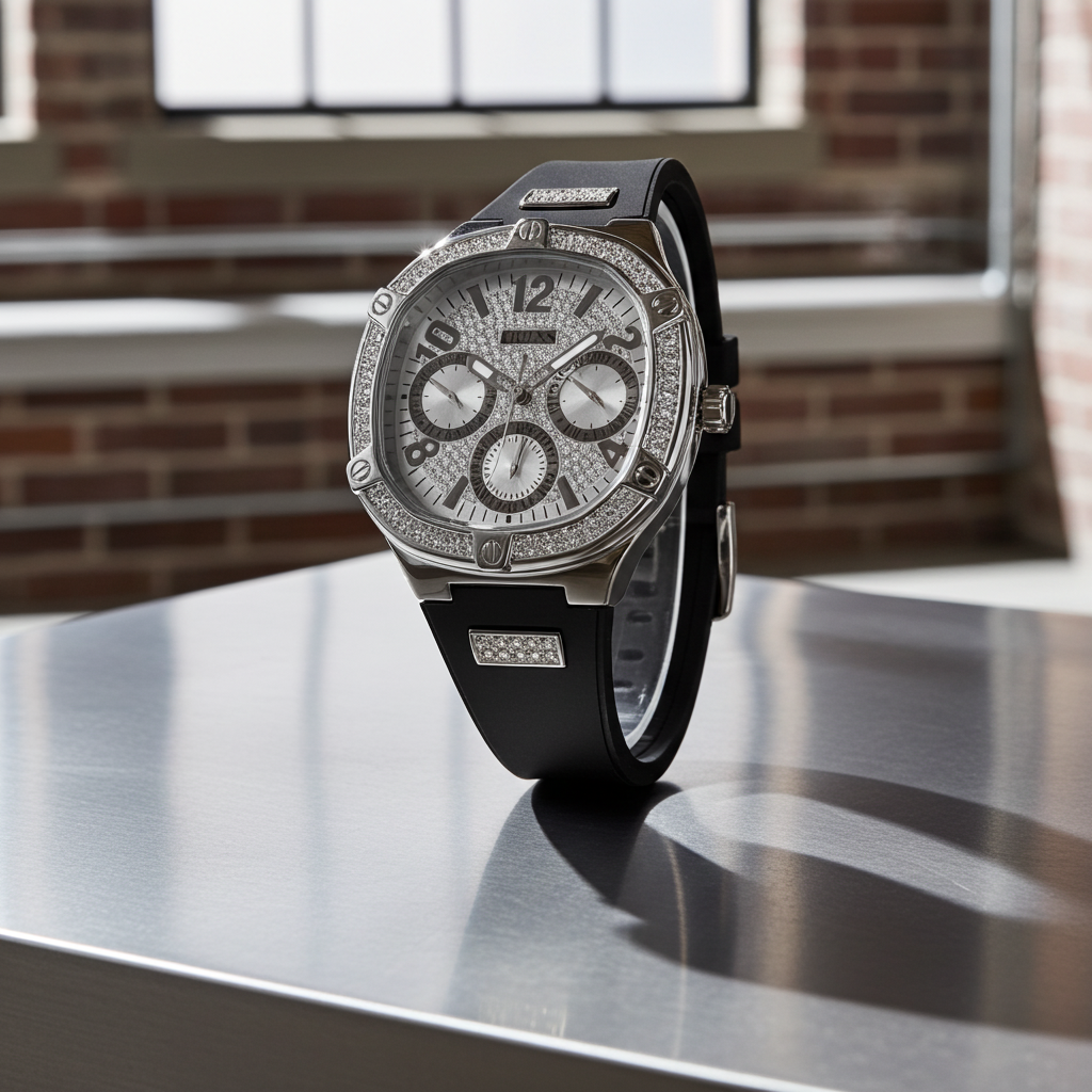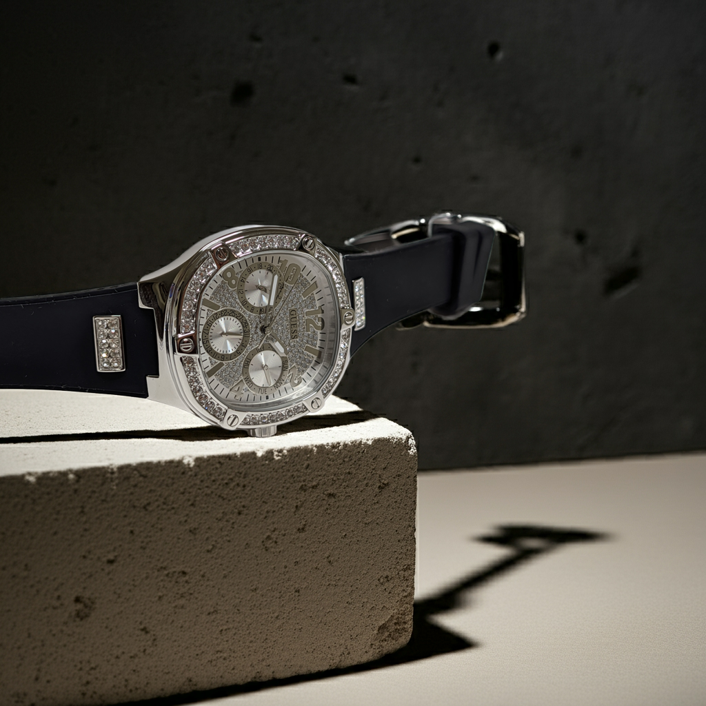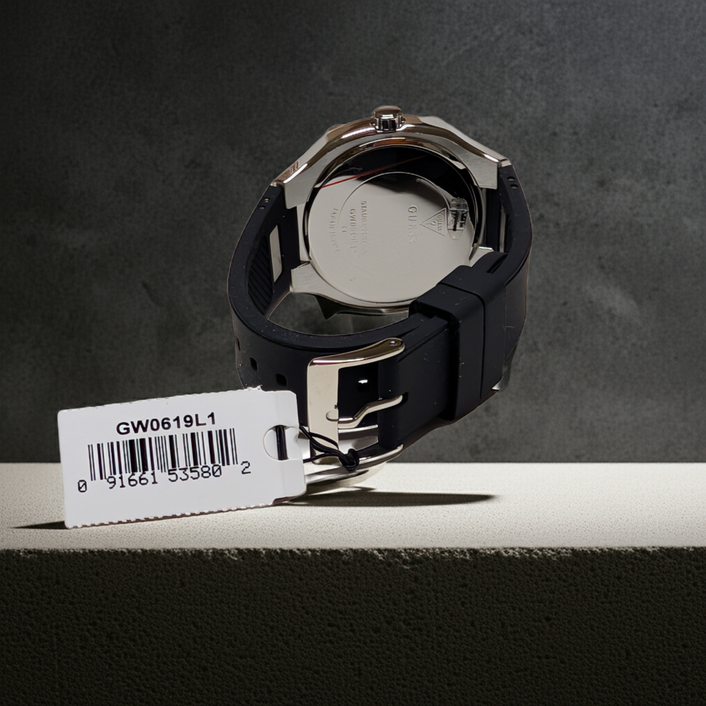 The Guess Duchess GW0619L1 Women's Watch is the epitome of elegance and contemporary flair. Its crystal-embellished silver dial and stainless steel case with black silicone strap bring modern style and timeless sophistication to any outfit. Durable, comfortable, and beautifully designed, it's perfect for everyday wear.