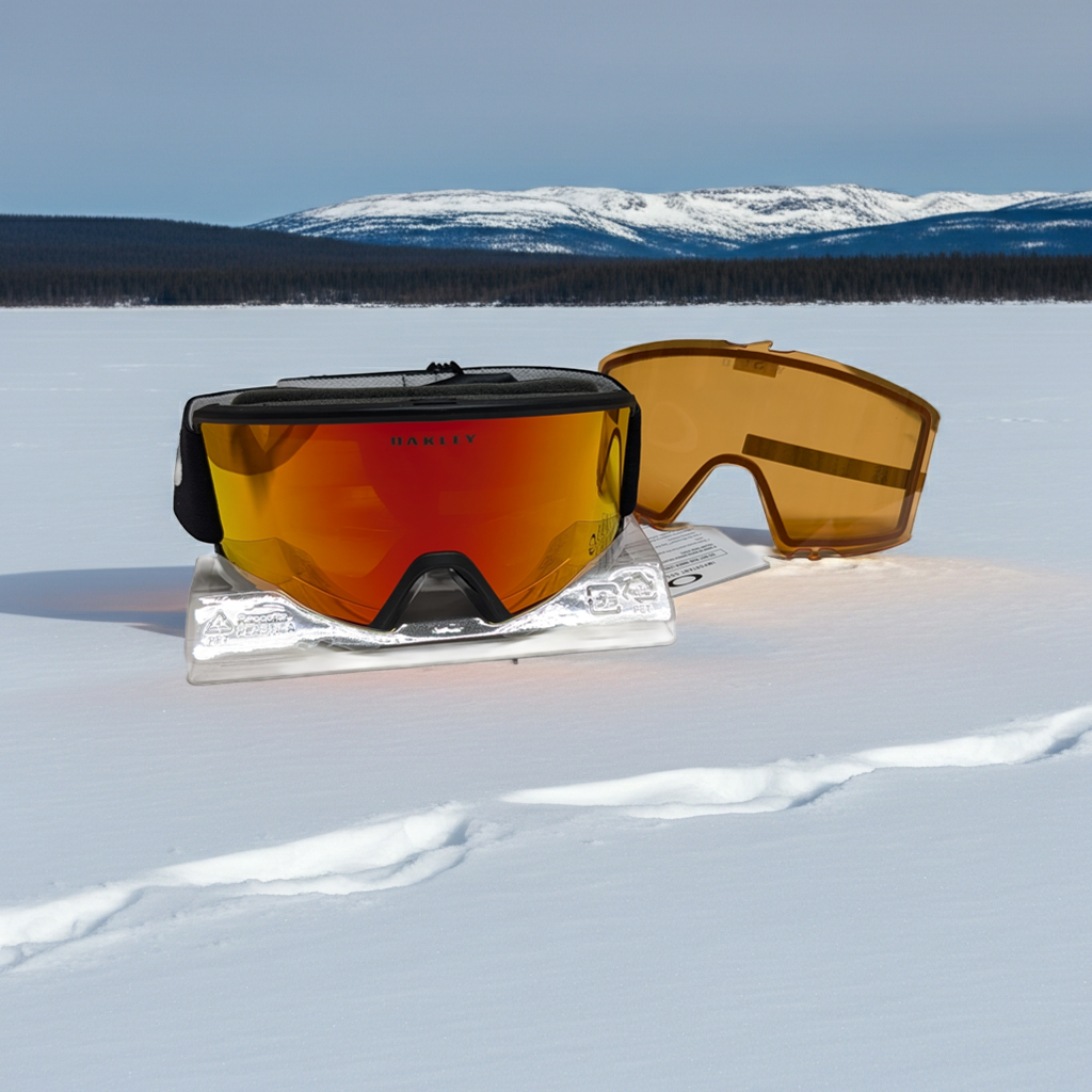 The Oakley Target Line L in Matte Black combines a jumbo cylindrical lens with a sleek, low-profile frame. This bundle features the Fire Iridium lens for bright conditions and a bonus Persimmon lens for low-light/snowy days.