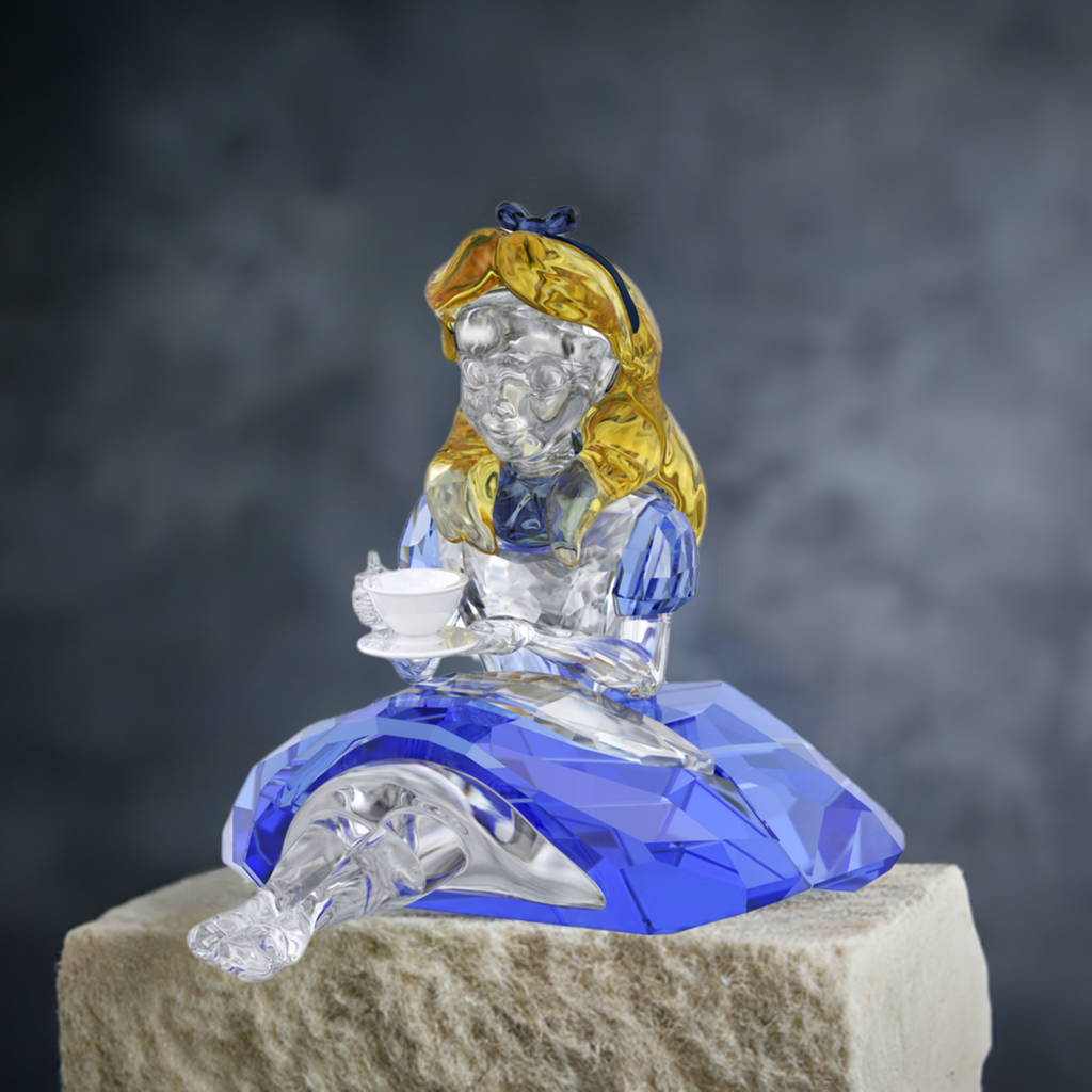 Creativity takes shape in this captivating piece inspired by a beloved fairytale. Capturing a memorable scene from the famous Disney story, it portrays Alice as an unexpected visitor at the Mad Hatter’s lively gathering. The sparkling design showcases 430 precisely cut surfaces and a vibrant palette, highlighting her rich sapphire attire and golden locks. An ideal present for those with an adventurous spirit. For display purposes only. Not a plaything. Unsuitable for individuals under 15.