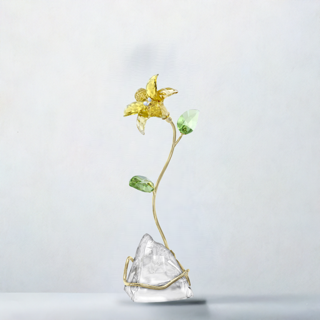 This stunning lily is a testament to Swarovski's artistry. Crafted with 222 facets, the vibrant yellow blossom captures and reflects light, creating a dazzling display. Accompanied by delicate green leaves, the lily gracefully rises from a natural, unfaceted crystal base, its golden stem adding a touch of elegance. This captivating design, symbolizing purity and innocence, is a beautiful addition to any home, requiring no vase or stand.